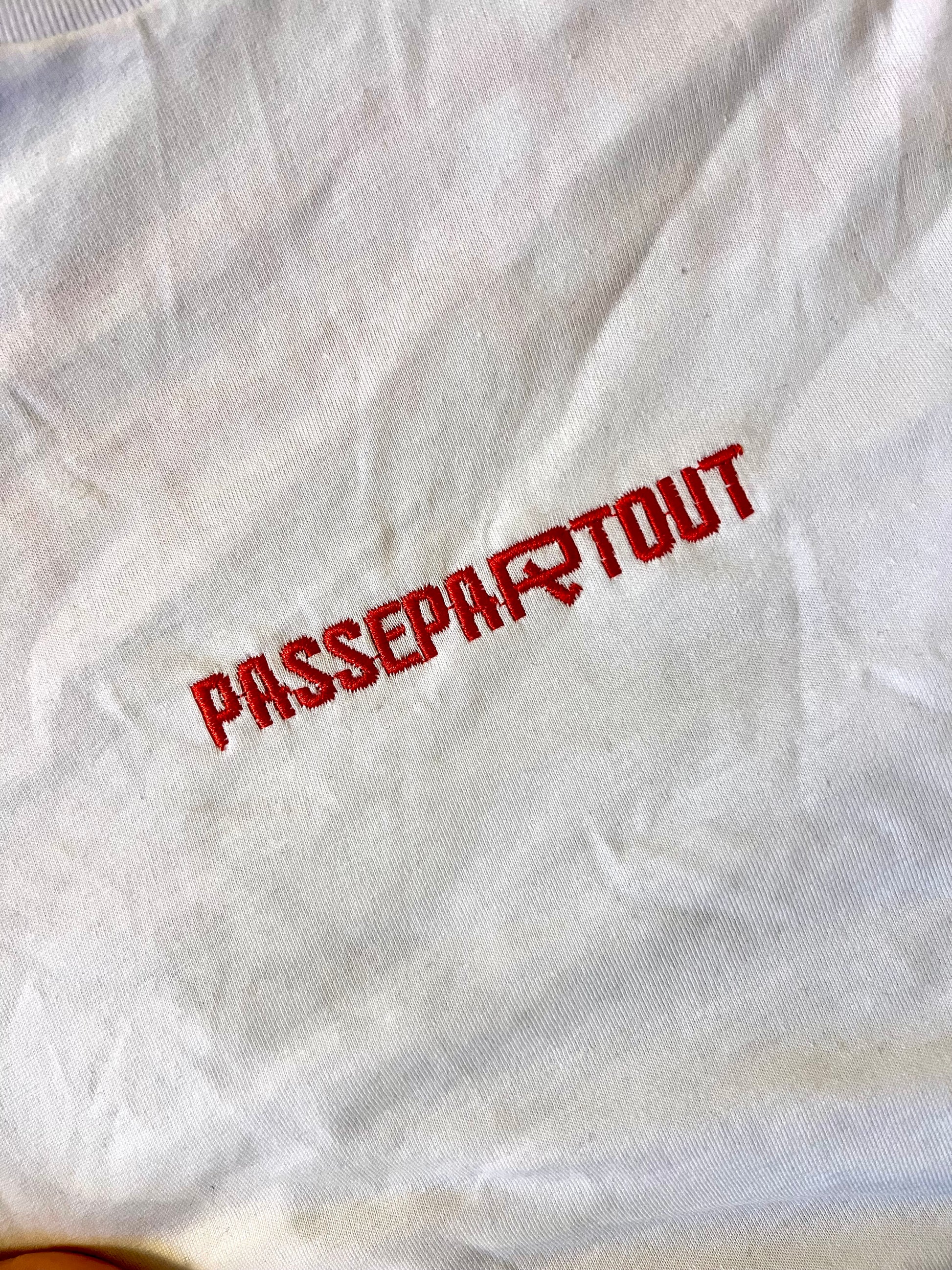 x weiß mit roter Stickung vorne // hinten bedrucktÂ